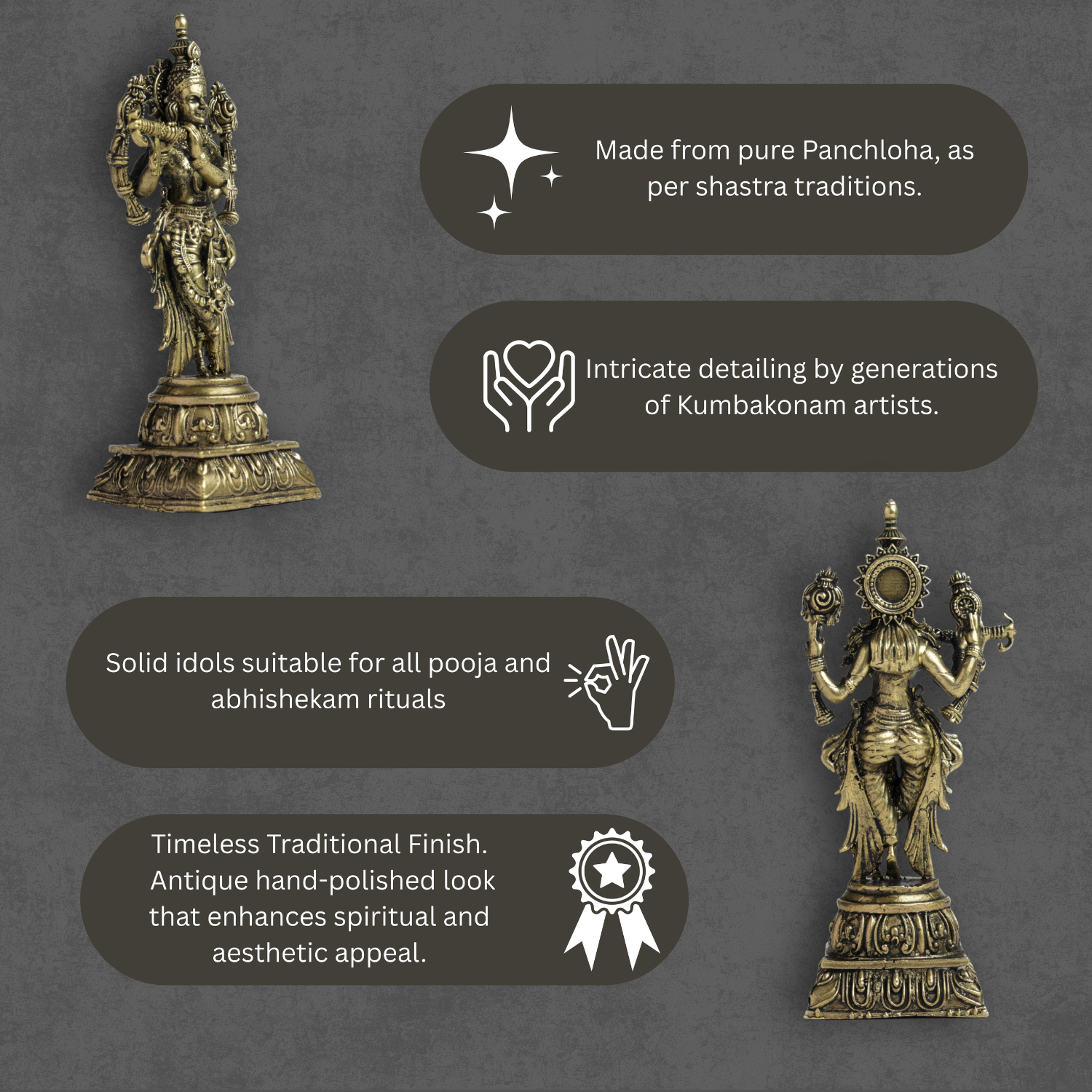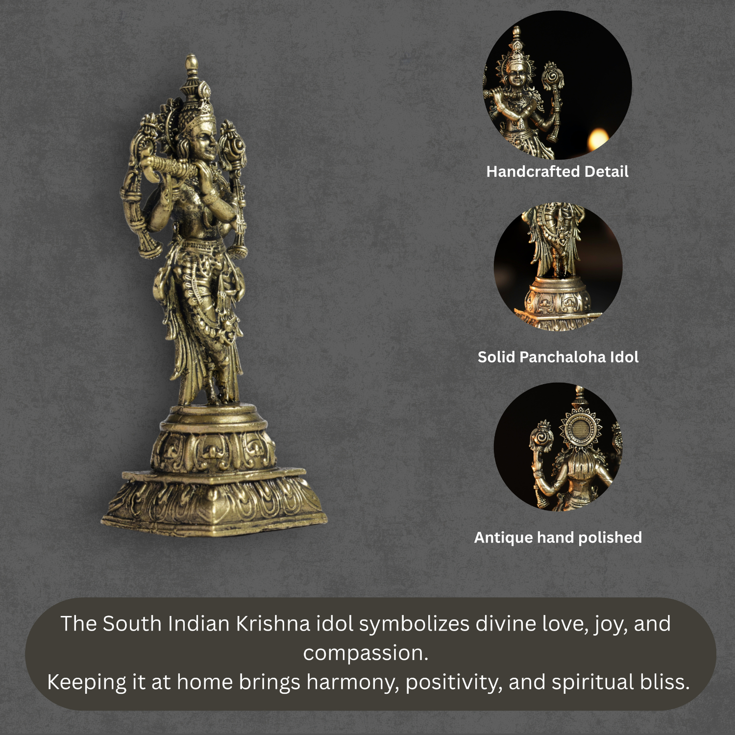 • Authentic Panchloha South Krishna idol crafted using traditional metal alloy methods followed in South Indian temple sculpture