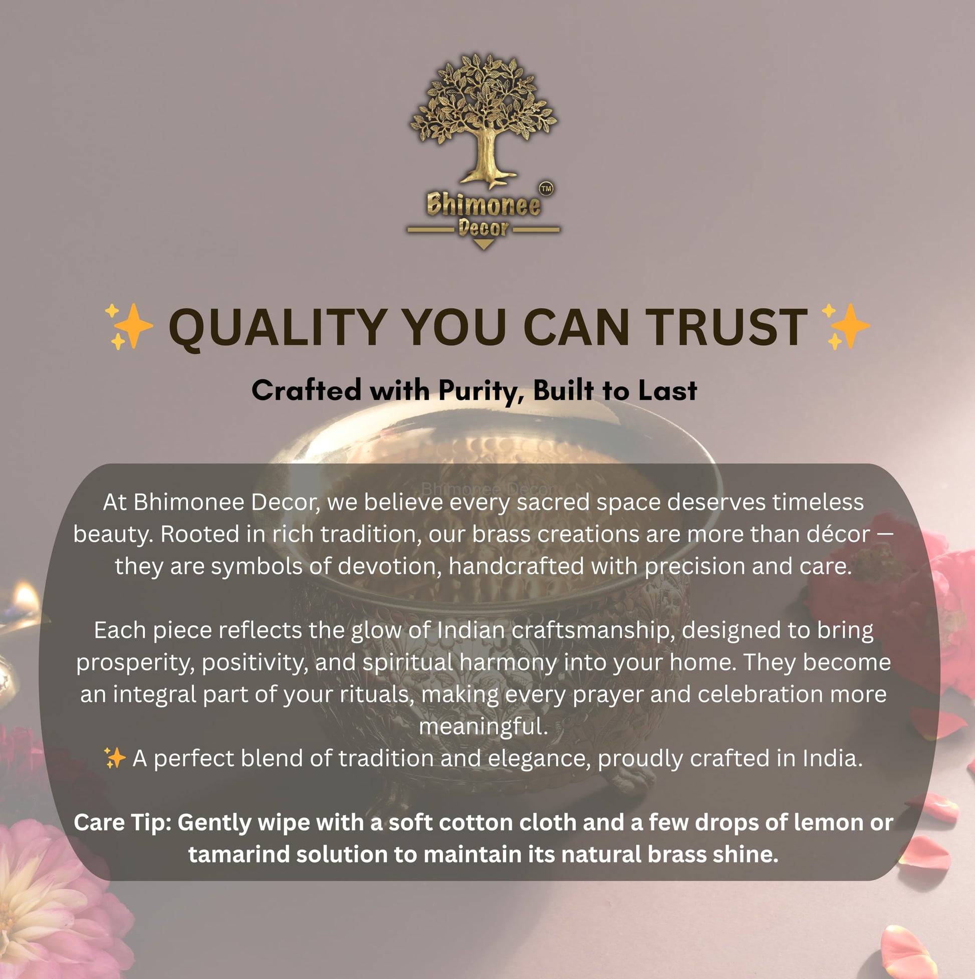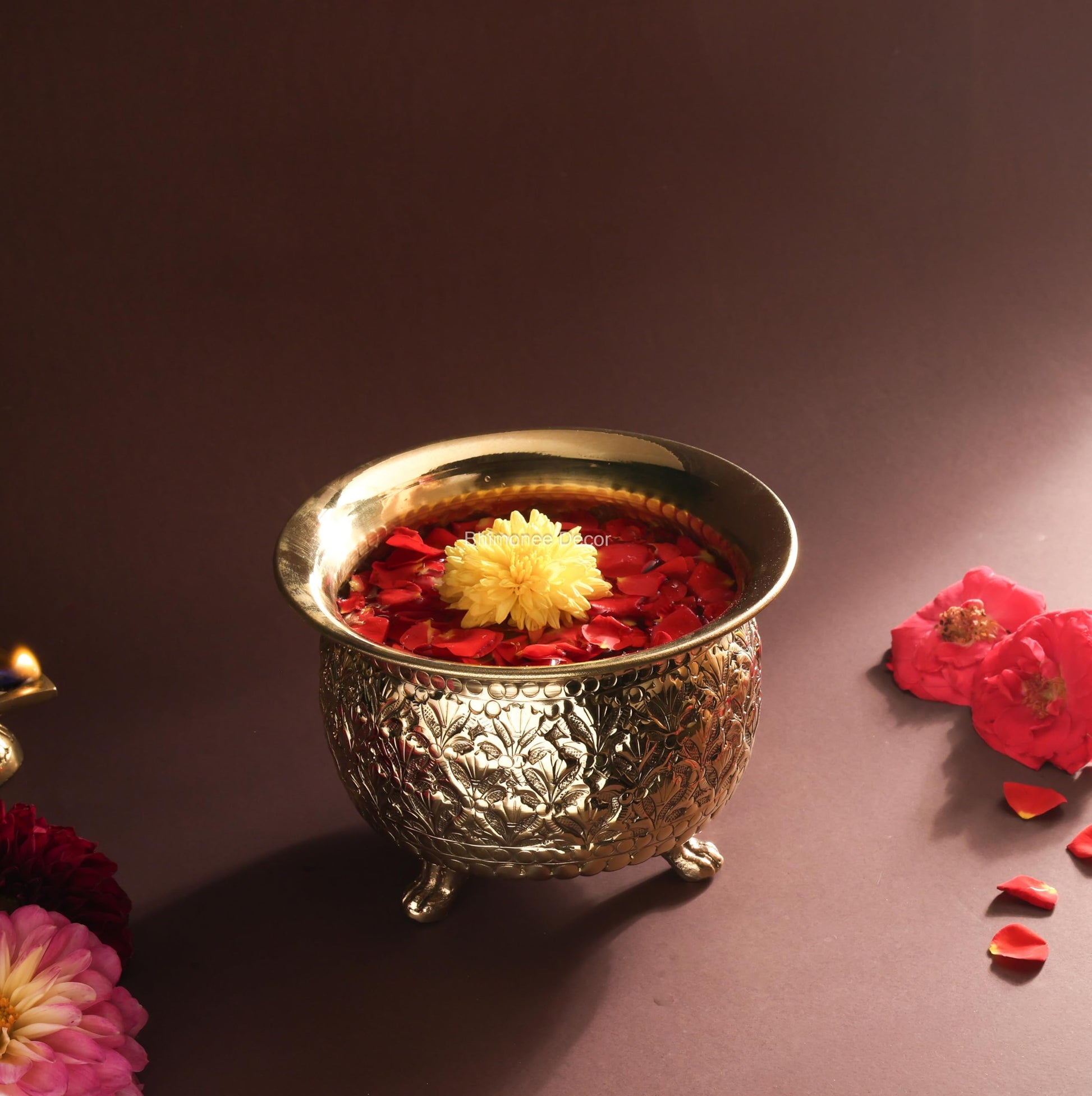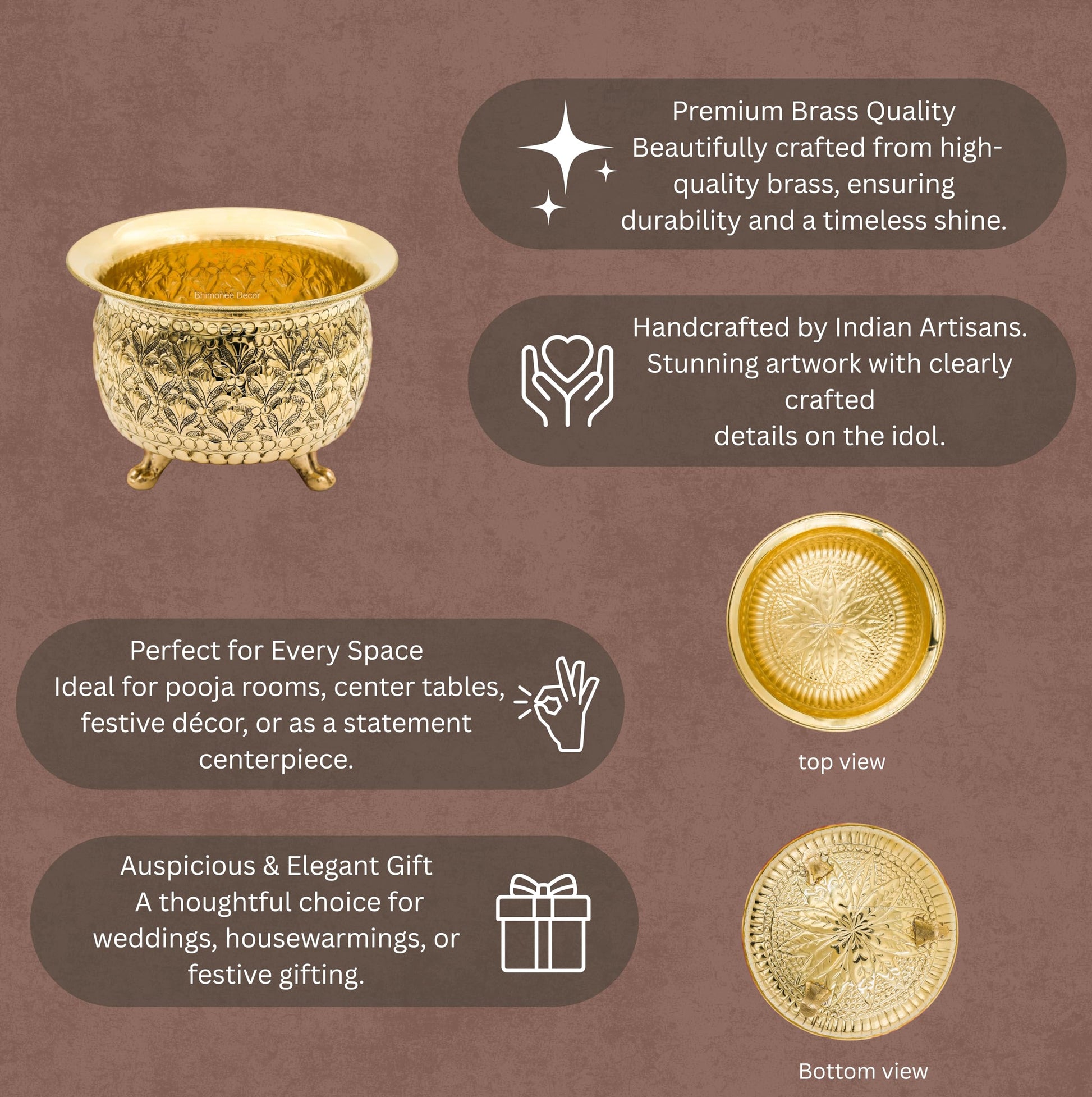 • Handcrafted Brass Bowl – Detailed floral carvings designed by skilled artisans for an authentic and traditional touch.