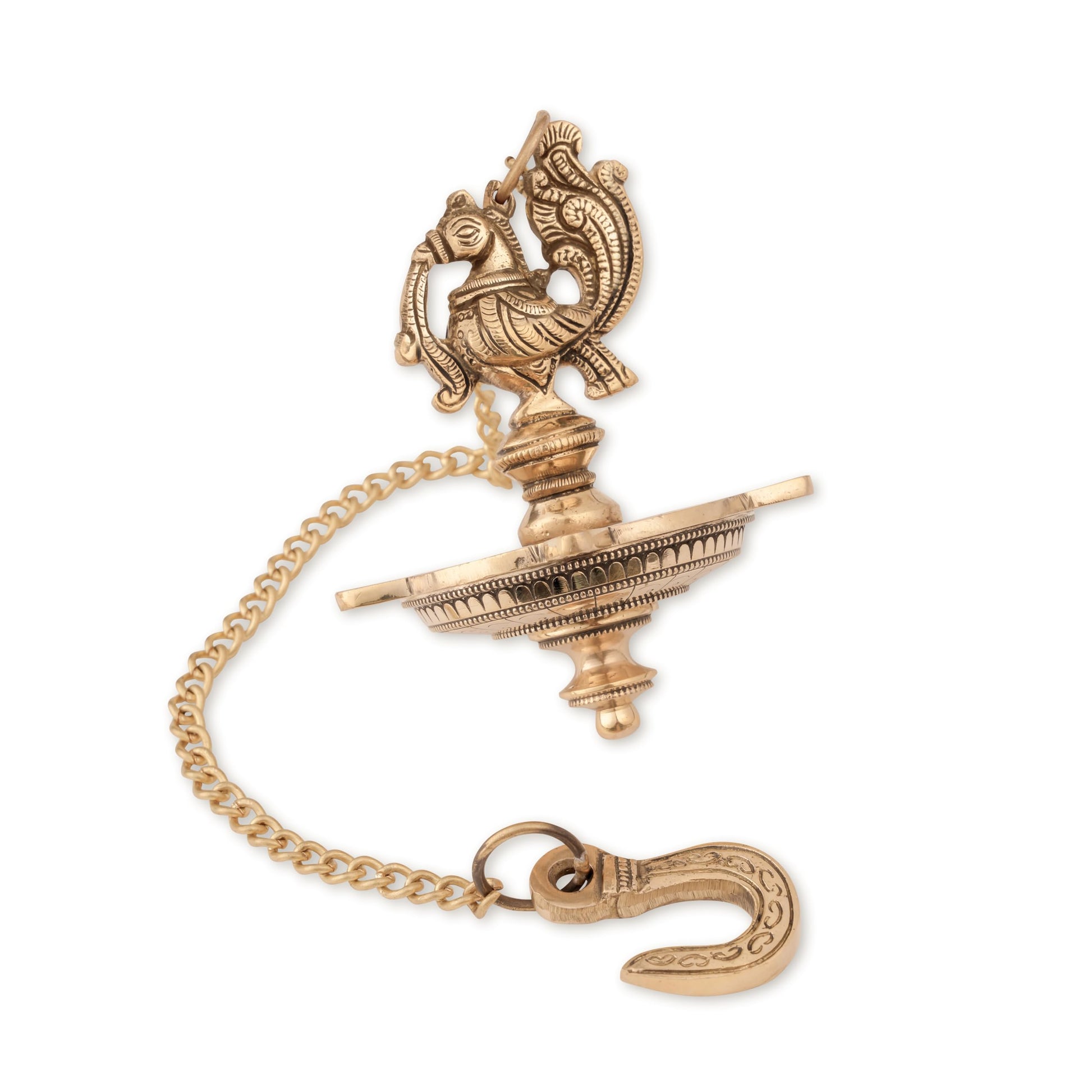 • Handcrafted Brass Hanging Diya with Peacock Motif – Showcasing intricate detailing, symbolizing grace, divinity, and traditional artistry.