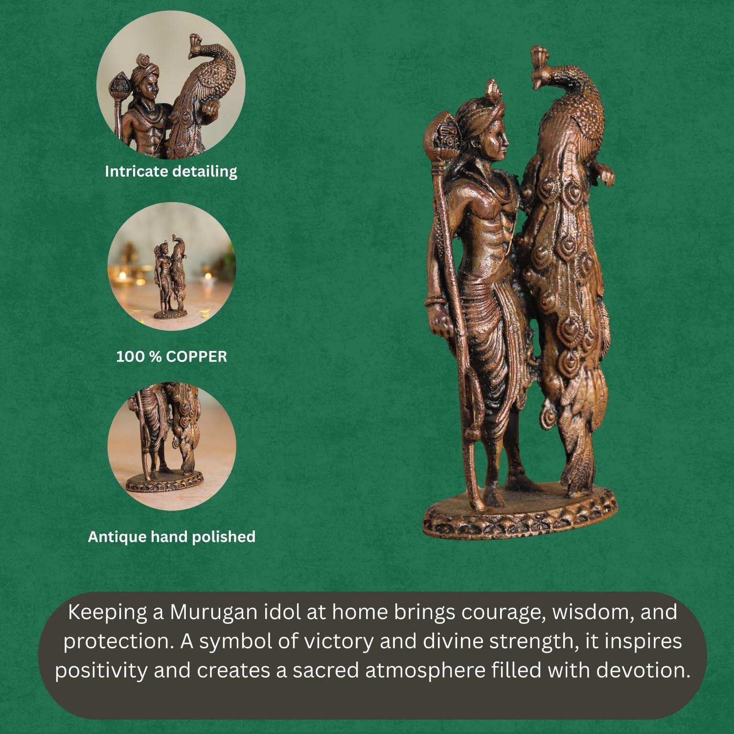 Copper Idols Lord Kartikeya Idol | Antique Brass Finish Murugan Statue with Peacock | Skanda Swamy Murti for Puja Mandir, Home & Office Decor | Spiritual Gift Item