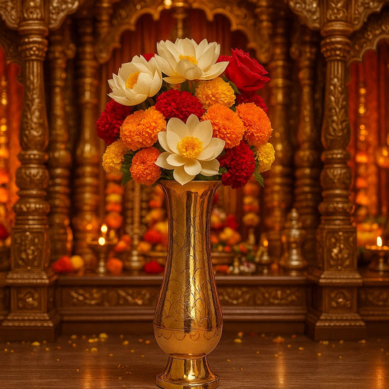 “The brass floral pooja plate has intricate carvings and shines after polishing”
