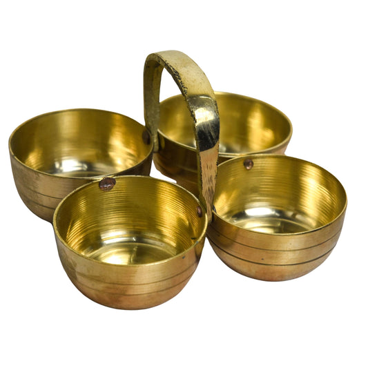 “The brass floral pooja plate has intricate carvings and shines after polishing”