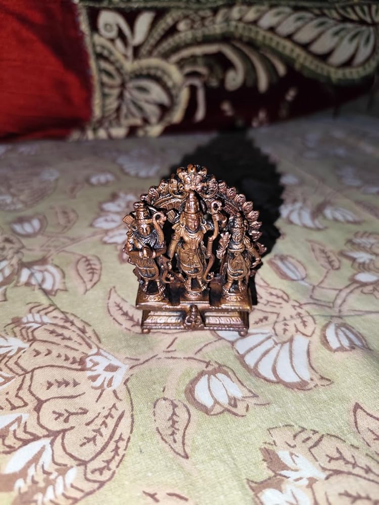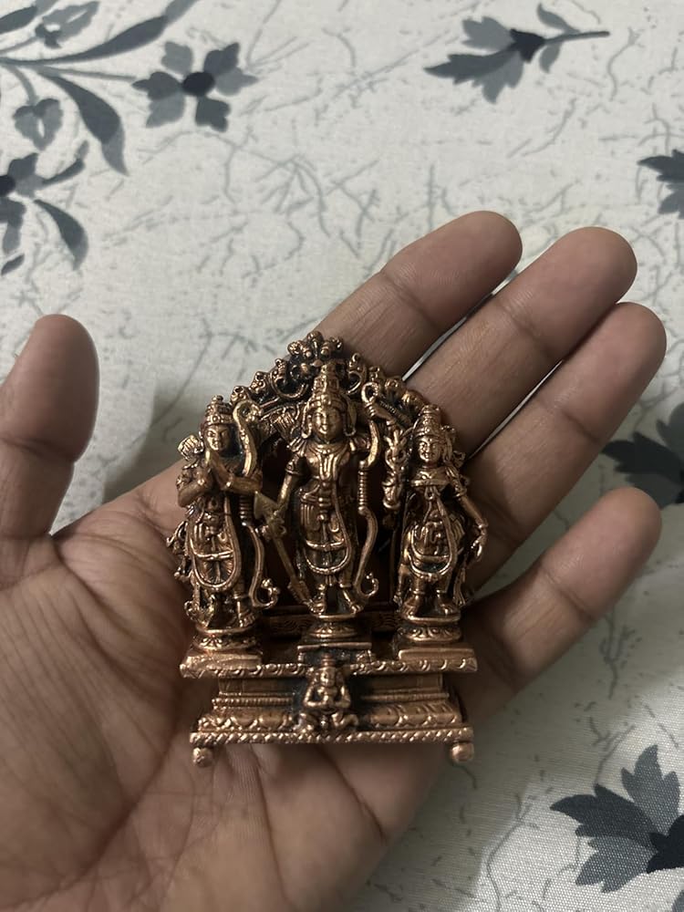 Details: Bhimonee Decor brings to you exclusive handcrafted copper idols, crafted by Indian artists with clearly crafted details on the idol. It is said that keeping the idol of Ram Darbar at home is good for improving domestic harmony and good luck. Whenever there is a chant of Ramcharitmanas, it is a mandatory requirememt to keep Ram Darbar at chanting place, where Hanuman ji will sit and listen to Ramayana.